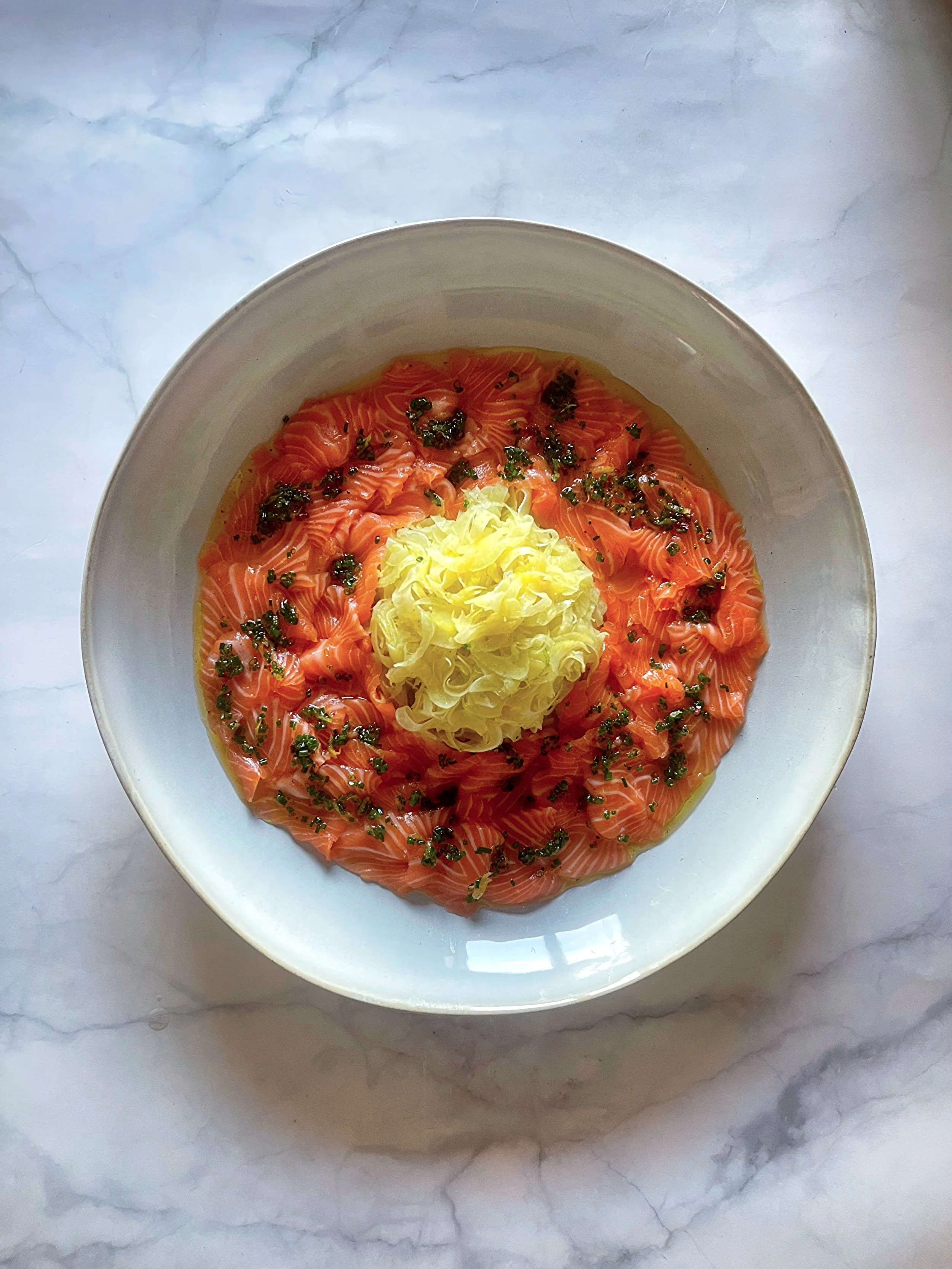 On cuisine un petit crudo de saumon, juste assaisonné de zestes de citron et citron vert, baies roses, ciboulette et huile d’olive.