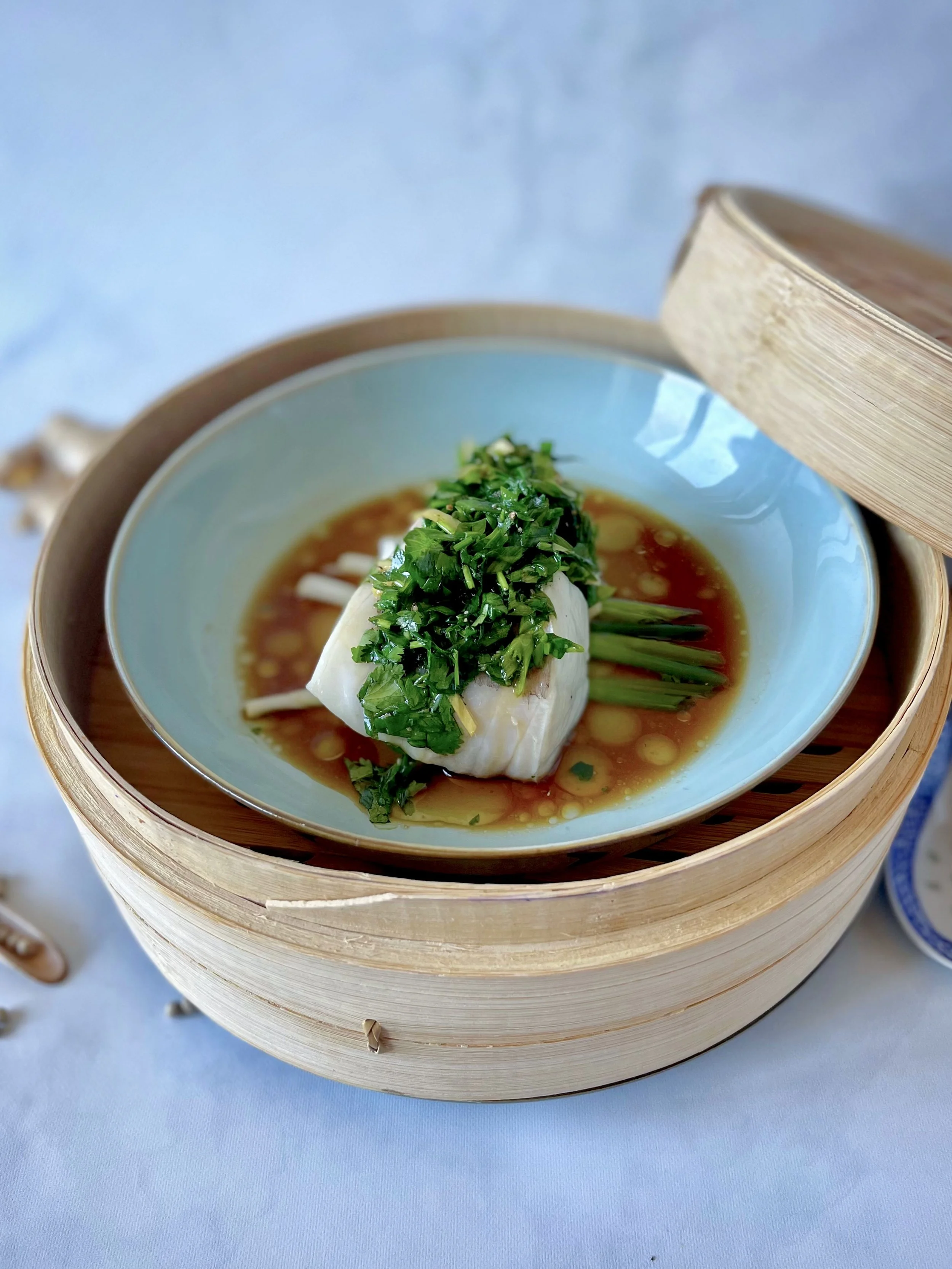 La cuisson à la vapeur convient pour tout type de poisson, je préconise ici les poissons à chair blanche à l’instar du cabillaud, du colin ou encore du haddock, mais vous pouvez adapter selon vos envies. La base aromatique qui accompagne le poisson est composée de ciboule, coriandre et gingembre; il est également possible d’ajouter un peu de piment, mais je n’en utilise généralement pas pour laisser la place aux autres ingrédients.