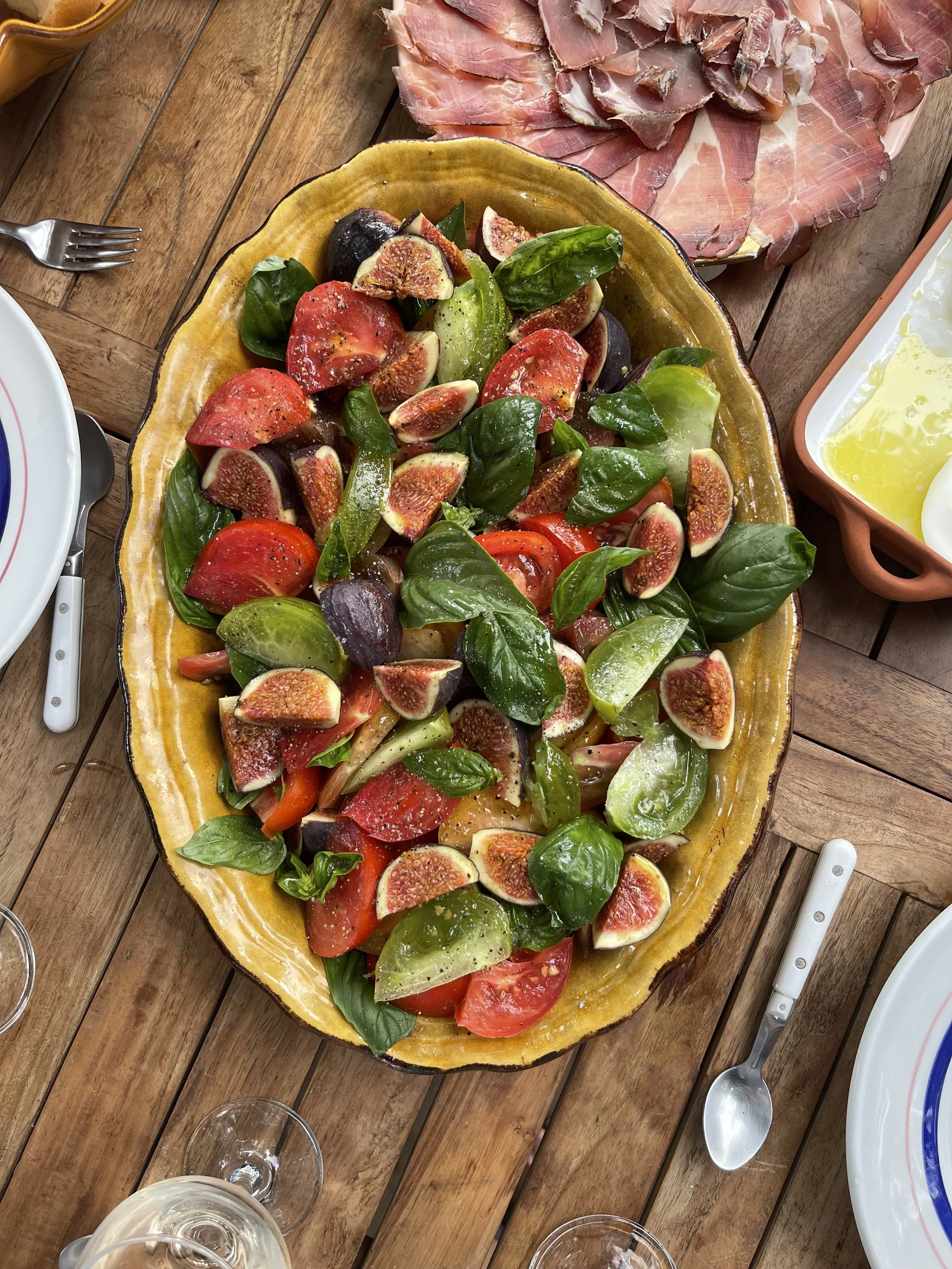 Cette recette — qui n’en est pas vraiment une — est l’un de mes grands classiques de l’été : une salade simple et colorée, composée de tomates anciennes de différentes variétés et de figues fraîches. L’assaisonnement est minimaliste : une bonne huile d’olive extra vierge, du sel et du poivre. Si l’envie vous prend, une touche de vinaigre balsamique peut faire des merveilles.