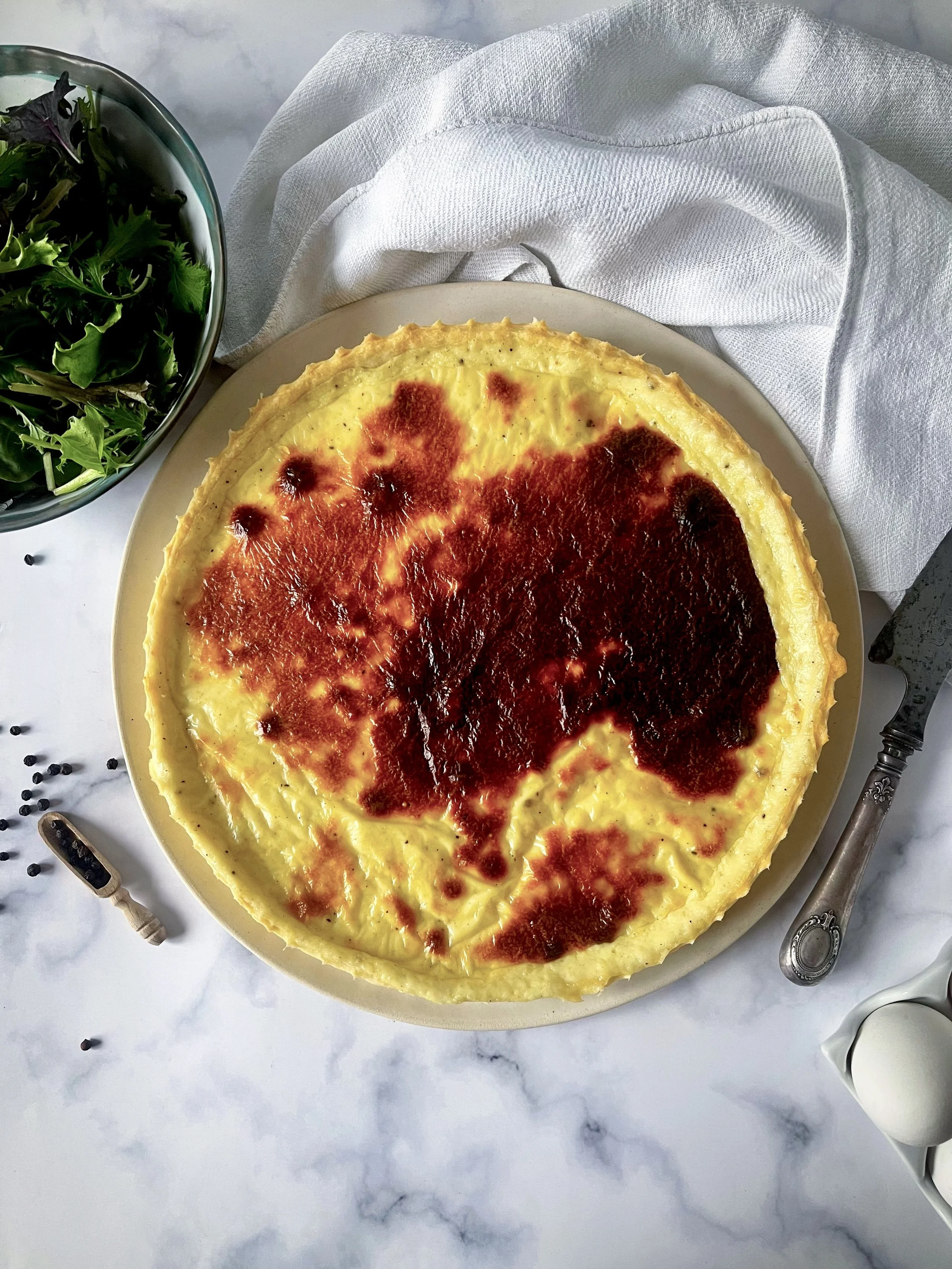 Elle se compose d’une pâte brisée maison (ou du commerce si vous manquez de temps) garnie d’une béchamel au fromage gratinée au four — le bonheur à l’état pur.