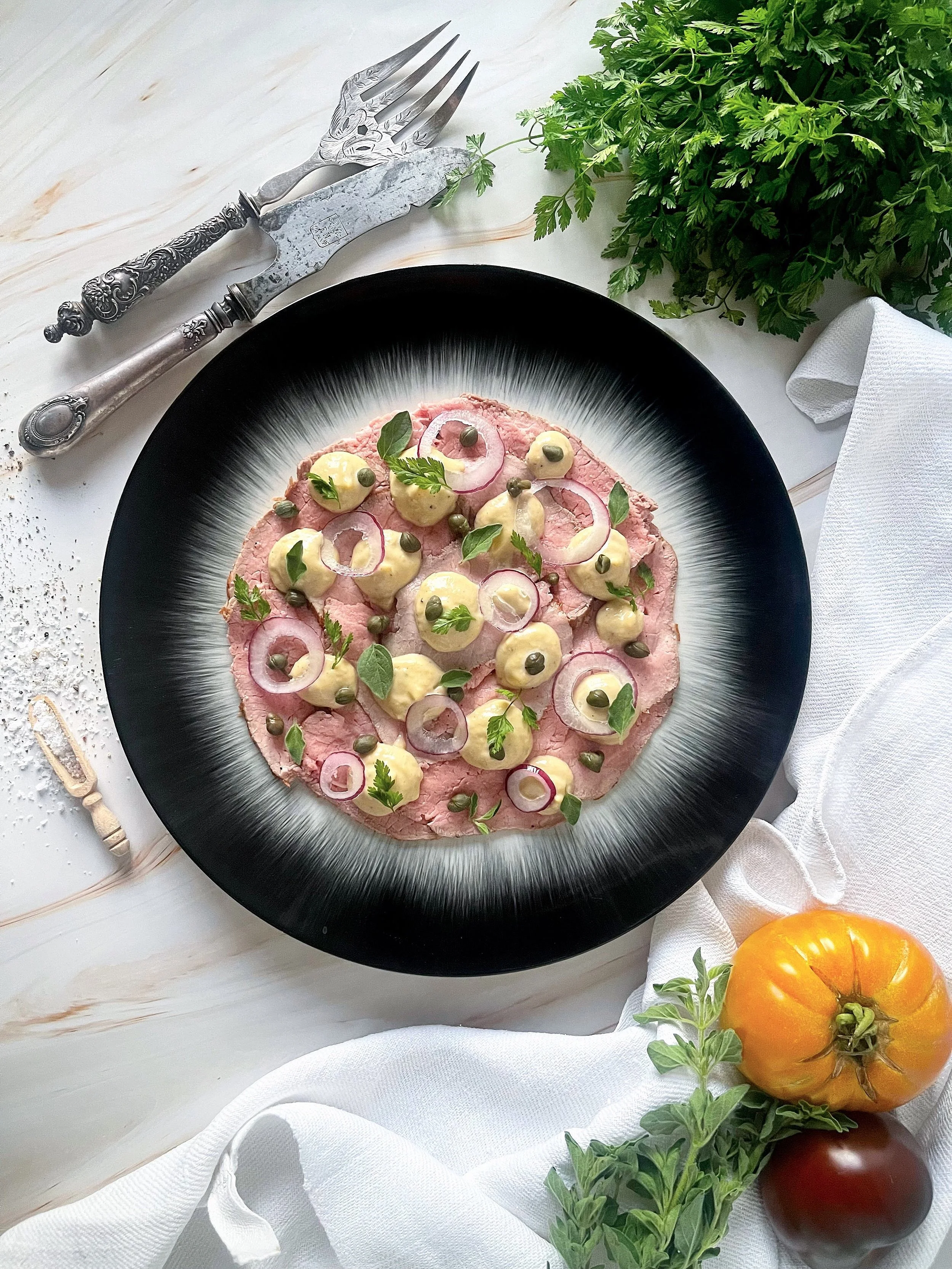 Répartissez la sauce sur la viande, puis ajoutez les rondelles d’oignon, les câpres, et éventuellement les herbes fraîches.